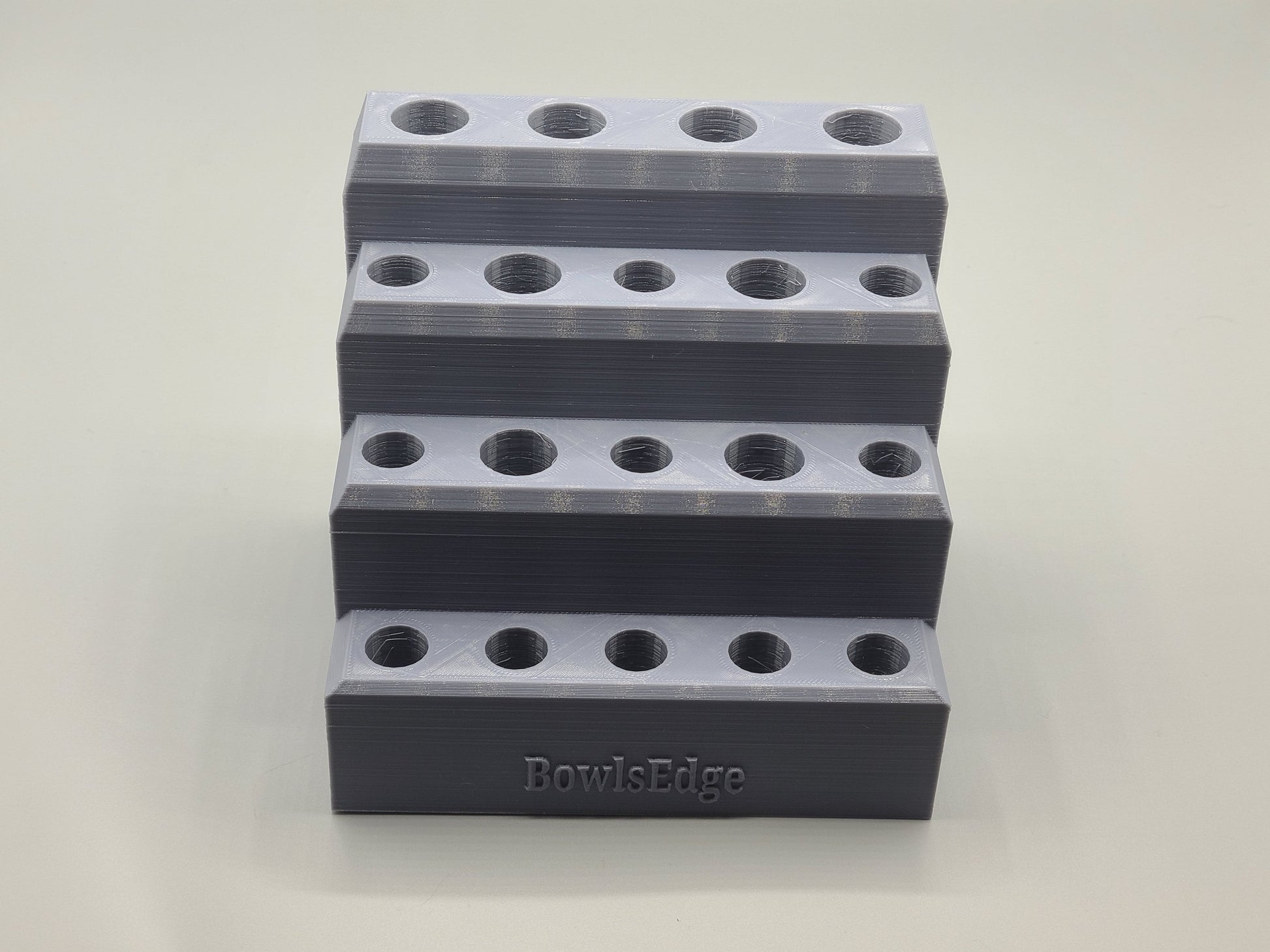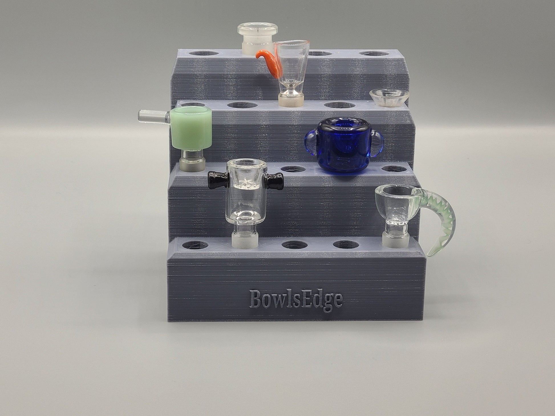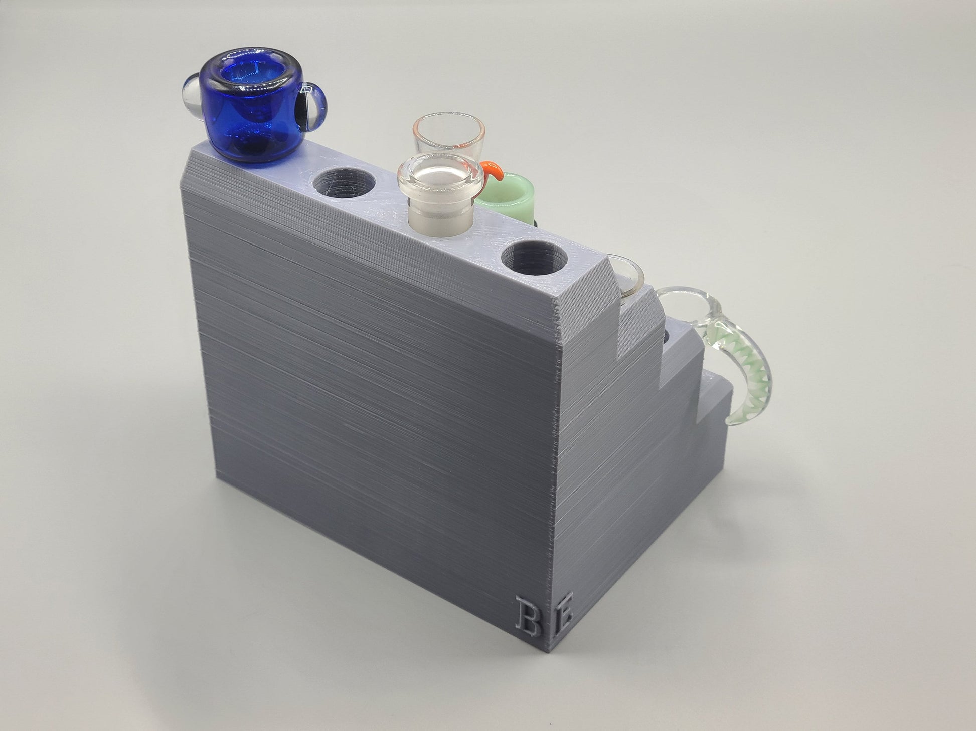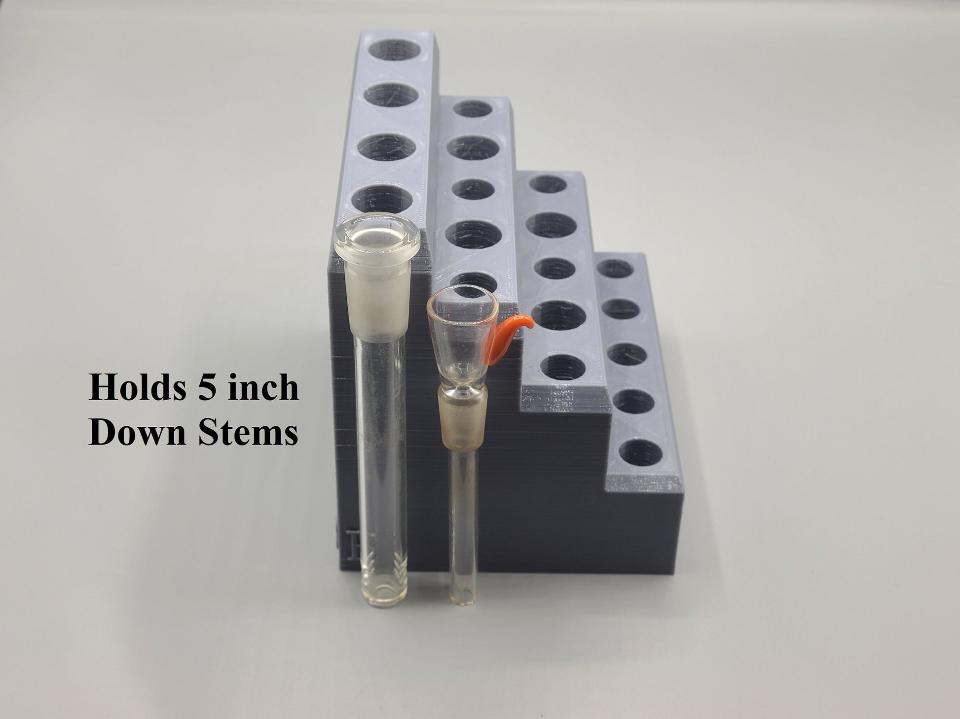 Protect and show off your downstems and bowls with this is a 19 hole display fits 14mm or 18mm male bowl, banger, sliders and stems. The tallest section can hold downstems of up to 5 inches. If you would like it for larger downstems please reach out!